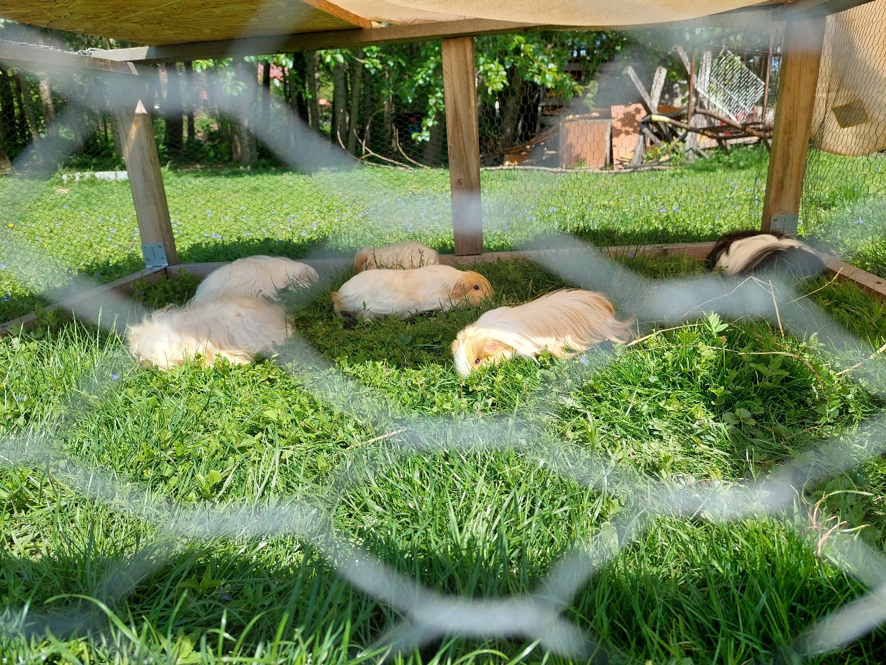 Myslím, že tuto kapitolu máte dostatečně nastudovanou před pořízením morčátka již z jiných zdrojů. Mě se nejlépe osvědčily klece. Jsou vzdušné, dobře se mi s nimi manipuluje a hlavně! Dobře se čistí / desinfikují!! Na dno podestýlám hobliny v dostačené tloušťce (6-8cm) a to vždy bezprašné kvalitě (Allspan) a bez parfemace!! Drobné piliny vůbec nekupujte, jsou prašné, mohou způsobit potíže jak v očích, tak v horních cestách dýchacích. A o binci, co z nich budete mít doma, se zmiňovat raději ani nebudu. Někdo má morčata na „koberečkách“. Já osobně jsem to vyzkoušela, ale takto je nutné jim měnit každý den. Málokteré morče se totiž naučí na záchůdek, jako králík. Navíc bych měla obavu, že se morče v době mé nepřítomnosti pustí třeba do inkontinenční podložky a toto není rozhodně něco, co by mohlo zvíře pozřít a případné zdravotní komplikace by bylo nutné řešit s veterinářem. Dalším vybavením v kleci mohou být kovové jesličky, či koule na seno. POZOR! Zde hrozí veliké riziko, že v ní morče uvázne a vážně se zraní. Seno dávám přímo do klece, případně do plastových jesliček, které jsou zavěšeny na vnější straně klece. I v těch kovových totiž hrozí riziko, že v nich víře uvázne, či v případě vyrušení a ve snaze vyskočit, může zůstat nožka zaklíněná v mezerách a úraz je tu. Uzavřené domečky nepoužíváme a nedoporučovala bych je ani vám. V případě nemoci se do něj zvíře bude automaticky uchylovat a vy jej nebudete mít pod stálým dohledem a prvotní příznaky počínajícího zdravotního problému, tak uniknou vaší pozornosti. Naopak vyvalování pupku v závěsné hamace nebo tunel alias prolézačka se u nás těší velké oblibě. Obě varianty takto částečně nahradí pocit úkrytu v domečku. Bohužel je třeba obě věci často čistit/prát. Velkým plusem v chovu je, když morčeti nabídnete možnost výběhu i mimo klec. Někdy jej není možné pustit volně po bytě, vlastně to ani nedoporučuji, vhledem ke kabelům, kobercům, květinám,… Morče prostor zkoumá i zuby, takže možnost se občas do něčeho zakousnout rádo využije. Zásah elektrickým proudem, či otrava po pozření pokojovky jsou velmi časté příčiny smrti u těchto hlodavců. Na internetu jistě najdete veliké množství produktů, rad a návodů na „home made“ výběh, klec i bydlení. Vždy prosím berte ohled na použitý materiál.